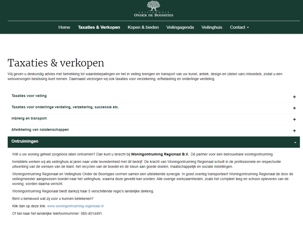 Deze parallelle belangen werken zich namelijk goed uit, immers hoe hoger de opbrengst van de veiling, des te meer ontvangt onze klant op haar ingebrachte inboedel. De inboedel van uw woning krijgt op deze manier een tweede leven waarbij op transparante wijze de hoogste opbrengst voor uw inboedel uit de woningontruiming gehaald wordt, zo hoeft u hier zich geen zorgen over te maken. In combinatie met een woningontruiming is dit namelijk een extra service van ons.